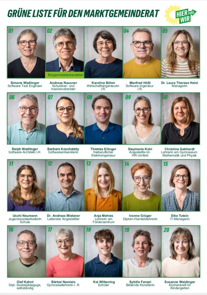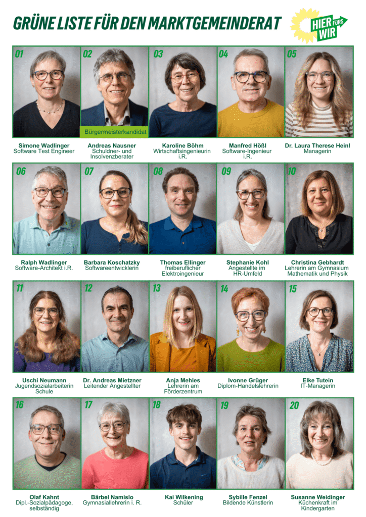 Neben Andreas Nausner als Spitzenkandidat wurde ein vielseitiges und engagiertes Team für die Liste zur Kommunalwahl aufgestellt. Die Kandidatinnen und Kandidaten bringen unterschiedlichste berufliche und persönliche Kompetenzen mit. Mit diesem Team und einem klaren Zukunftsbild starten Bündnis 90/Die Grünen in einen engagierten Wahlkampf. Die Botschaft ist klar: